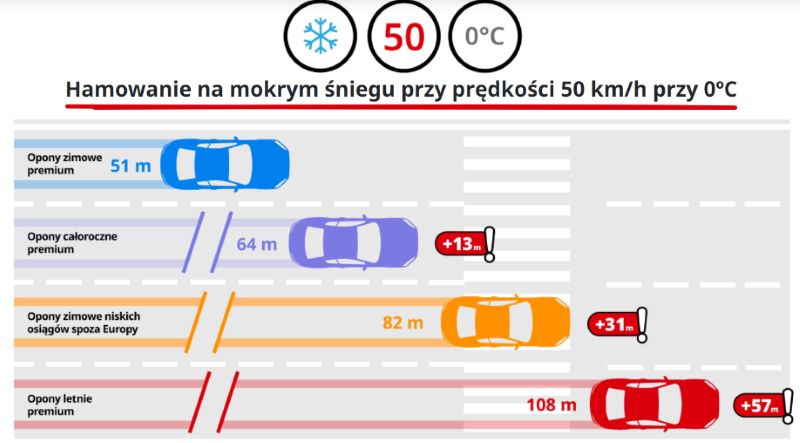 Z kolei na mokrym śniegu przy 0 st. różnica między zimowymi premium i letnimi to ponad 50 m. Z prędkości 50 km/h! To ponad 11 długości samochodu lub połowa boiska piłkarskiego.